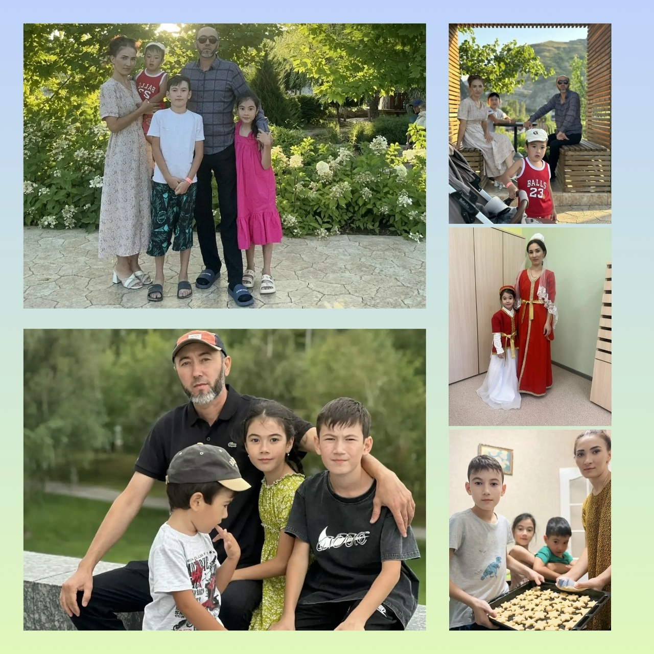 Каждое лето эта дружная семья проводит на своей исторической Родине.Мама сделала традицией готовить с детьми национальные сладости, а папа, в свою очередь, учит ребят рыбалке. Особенно трогательно их участие в фестивалях, где они с гордостью демонстрируют костюмы и наряды, подготовленные мамиными руками.